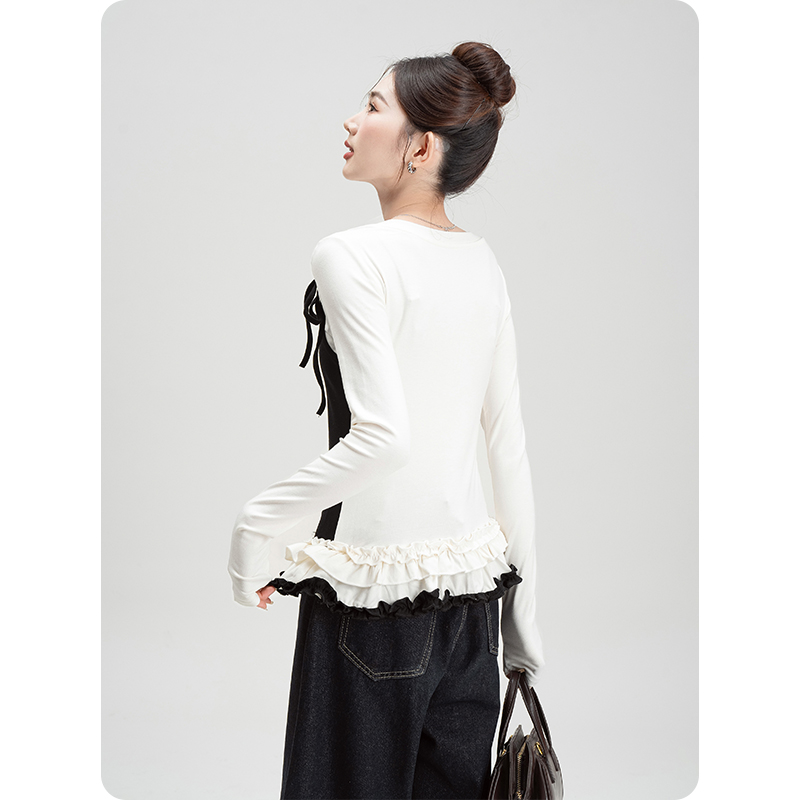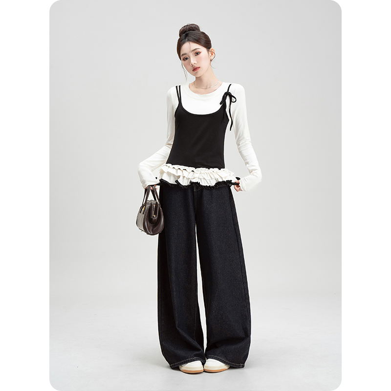 内搭修身 女装 上衣 新款 妮茨维黑白撞色假两件吊带拼接花边T恤秋季