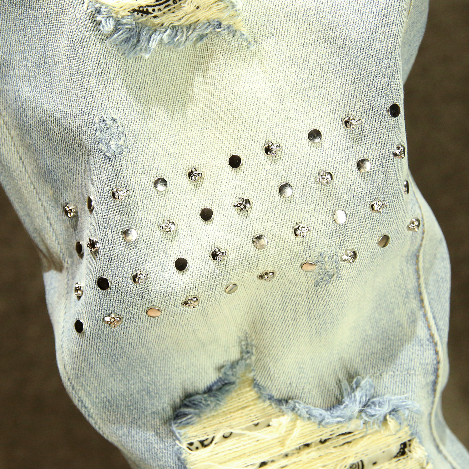 浅蓝色破洞牛仔裤 子潮牌刮烂补丁长裤 男士 弹力裤 小脚修身 2025新款