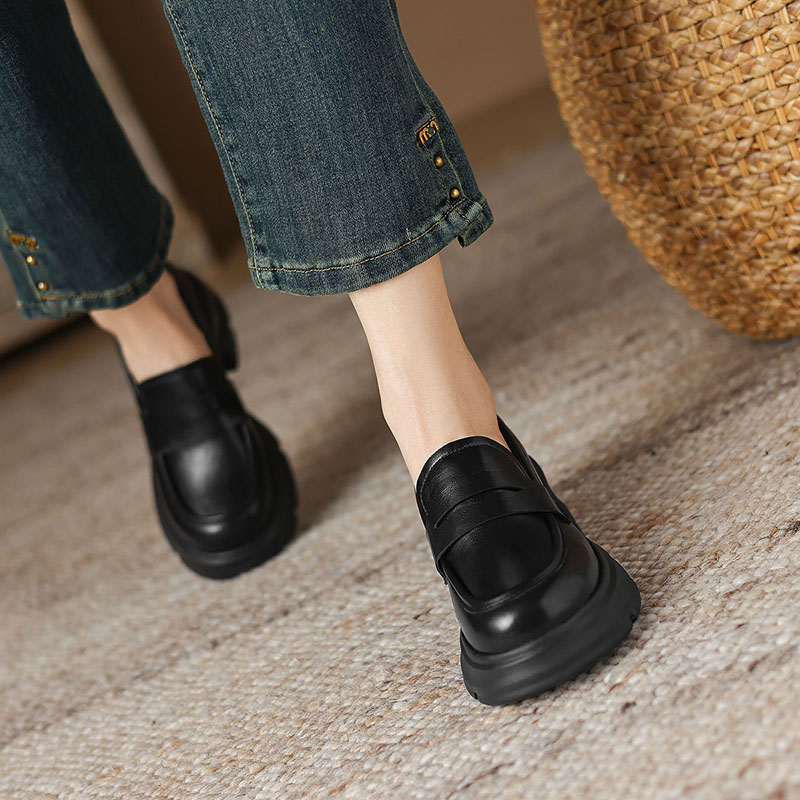 真皮舒适透气增高单鞋 女新款 黑色厚底百搭气质乐福鞋 阿么手工女鞋