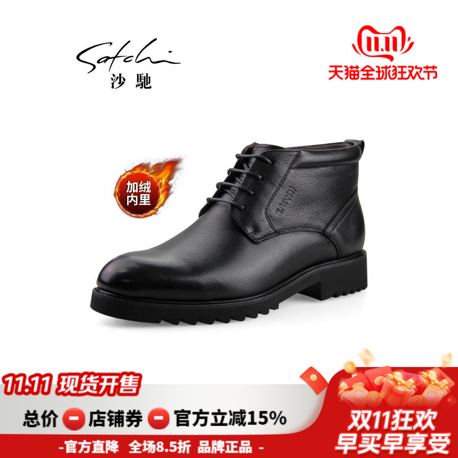 加绒保暖切尔西靴高帮棉靴皮靴 男靴子真皮冬季 沙驰男鞋 棉鞋