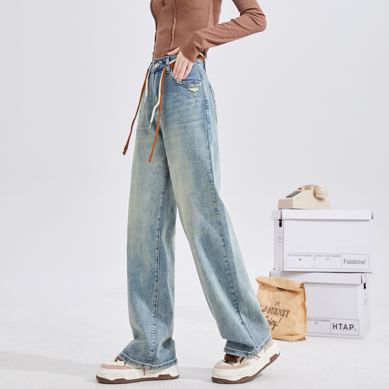 小个子穿搭阔腿宽松长裤 新款 子 女春秋季 自然涩黑色做旧直筒牛仔裤