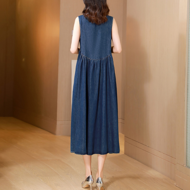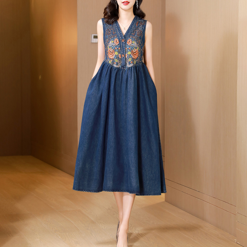 2025春民族风重工刺绣牛仔连衣裙女收腰显瘦无袖 V领气质大摆长裙