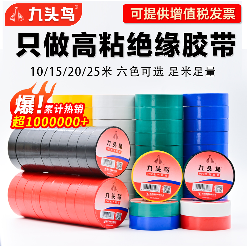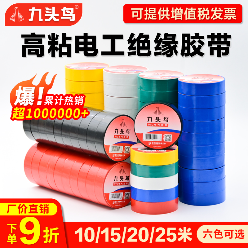 整箱批发200卷九头鸟电胶布电工绝缘胶带PVC阻燃防水耐高温黑胶布舒氏高压汽车线束白色防漏电线电缆胶布
