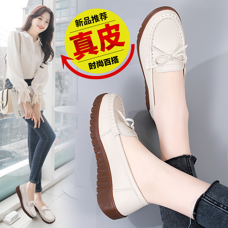 春季 一脚蹬乐福豆豆鞋 新款 中老年女鞋 轻便软底女士皮鞋 真皮妈妈鞋