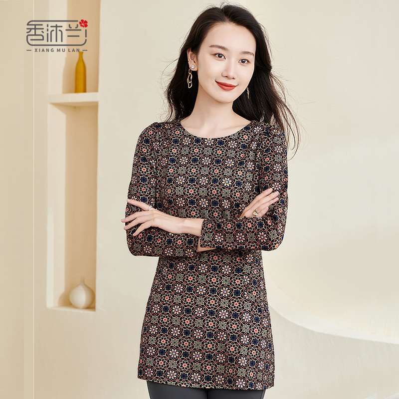 中长款 棉质圆领宽松印花大码 T恤 针织上衣女长袖 香沐兰2025春秋款