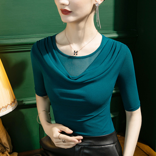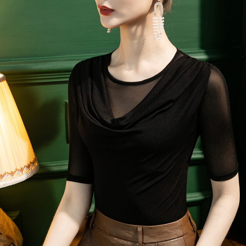 女五分袖 网纱打底衫 修身 性感拼接中袖 2025秋季 上衣设计感小衫 新款