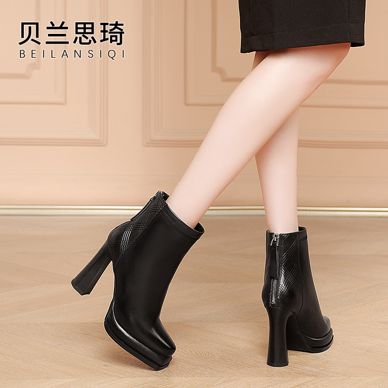 真皮方头防水台粗跟短靴女2025秋冬季 后拉链加绒厚底高跟马丁靴子