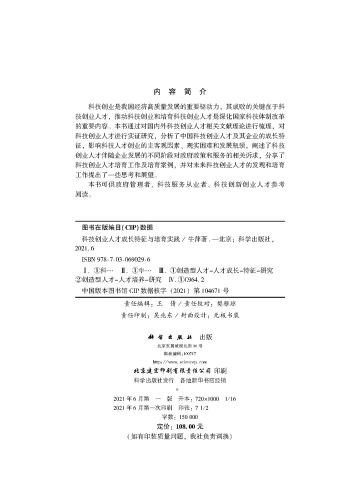 科技创业人才成长特征与培育实践 社 牛萍科学出版