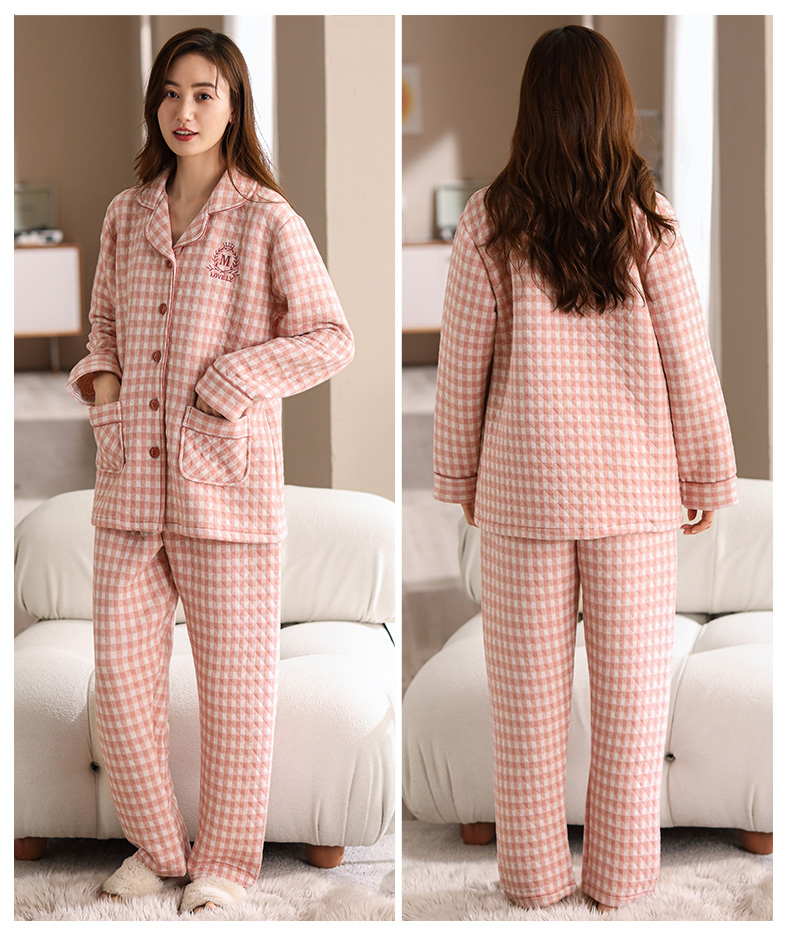 夹棉套装 空气棉秋冬三层保暖夹层睡衣女士加厚纯棉长袖 家居服薄款