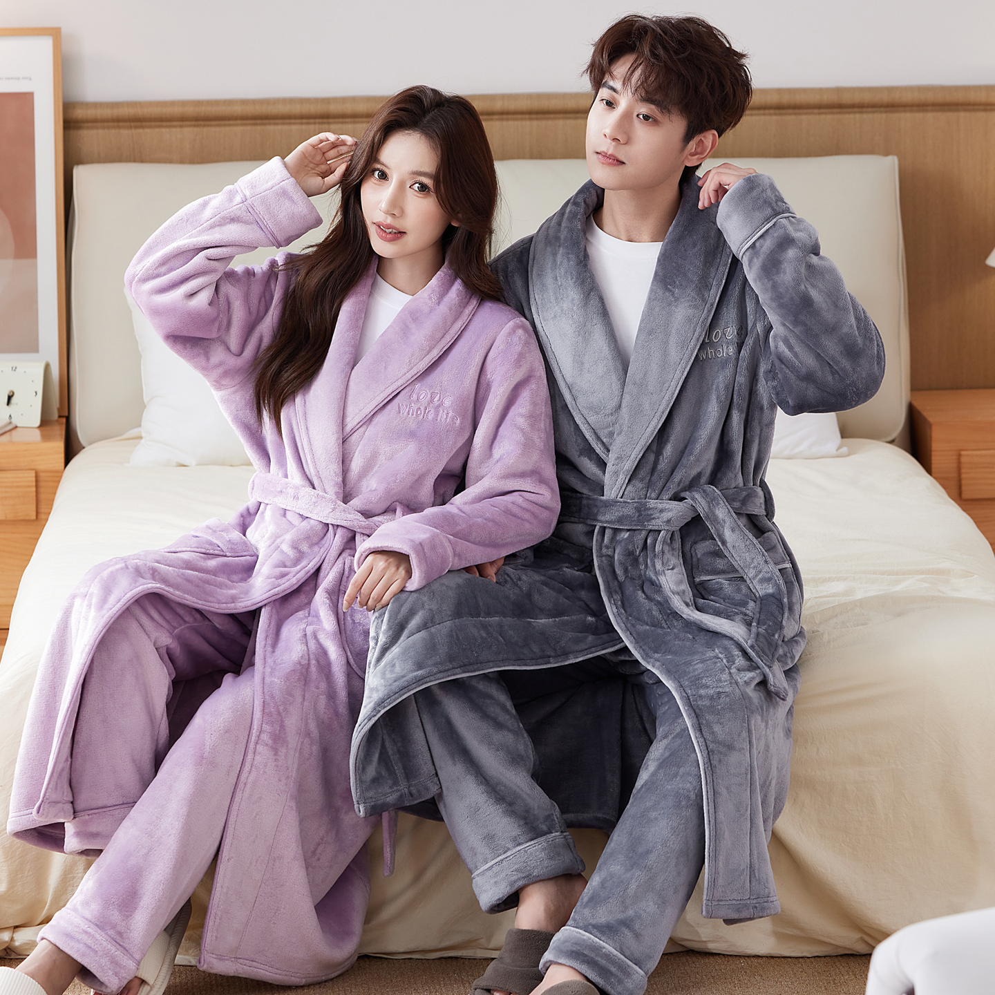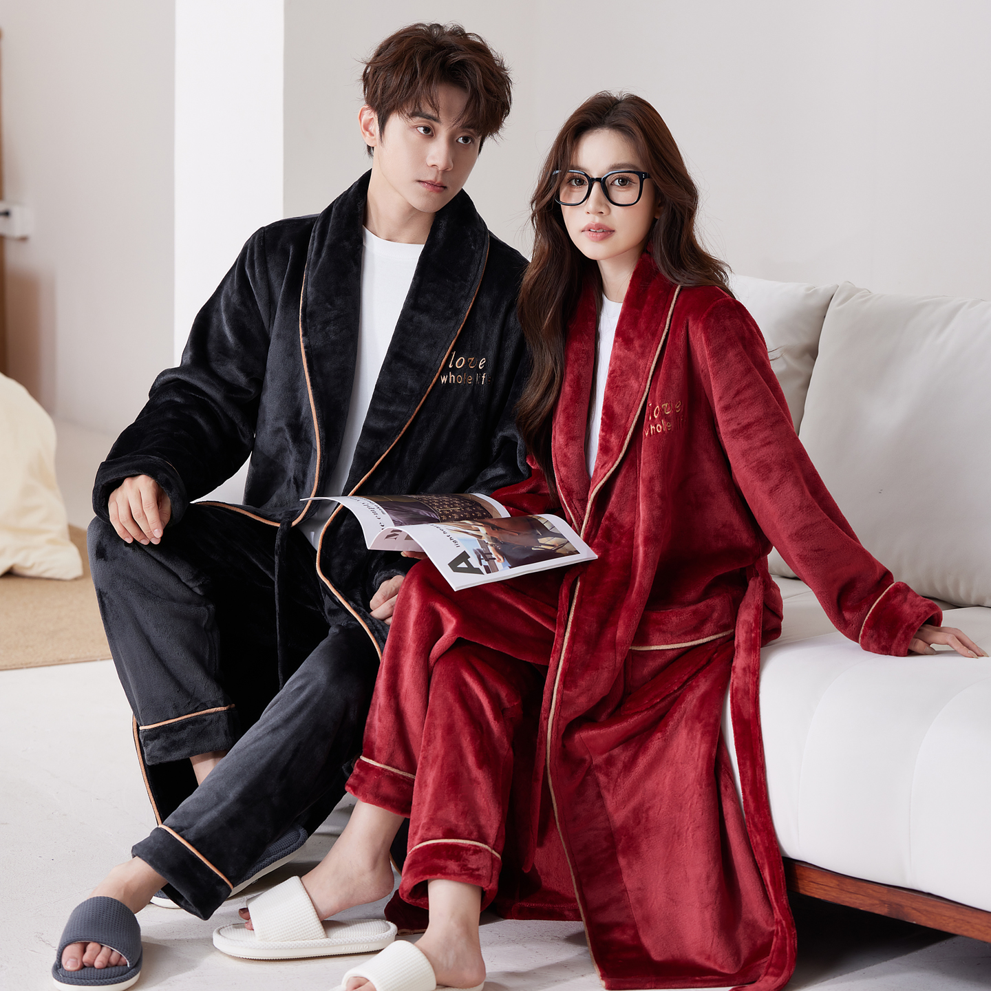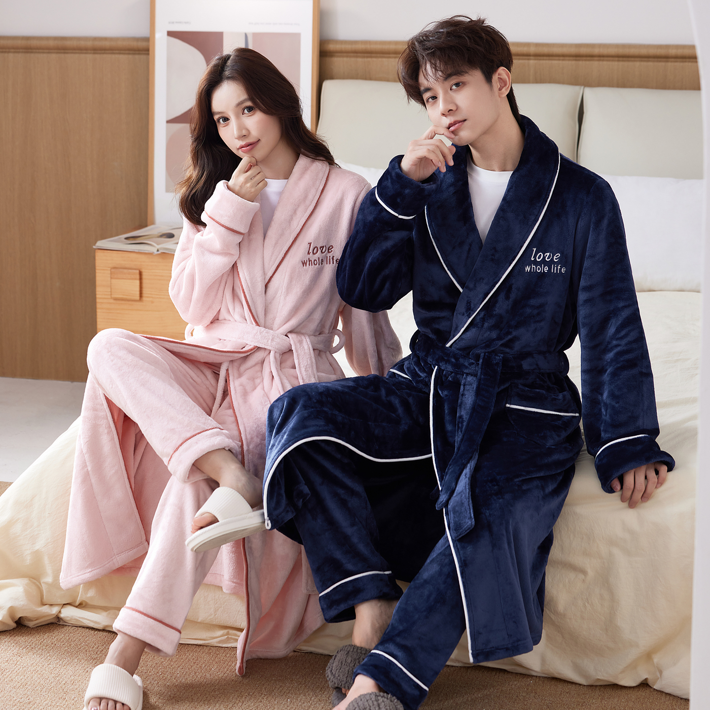 大码 春秋开衫 女士家居服 加厚珊瑚绒睡衣女冬法兰绒加绒套装 秋冬季