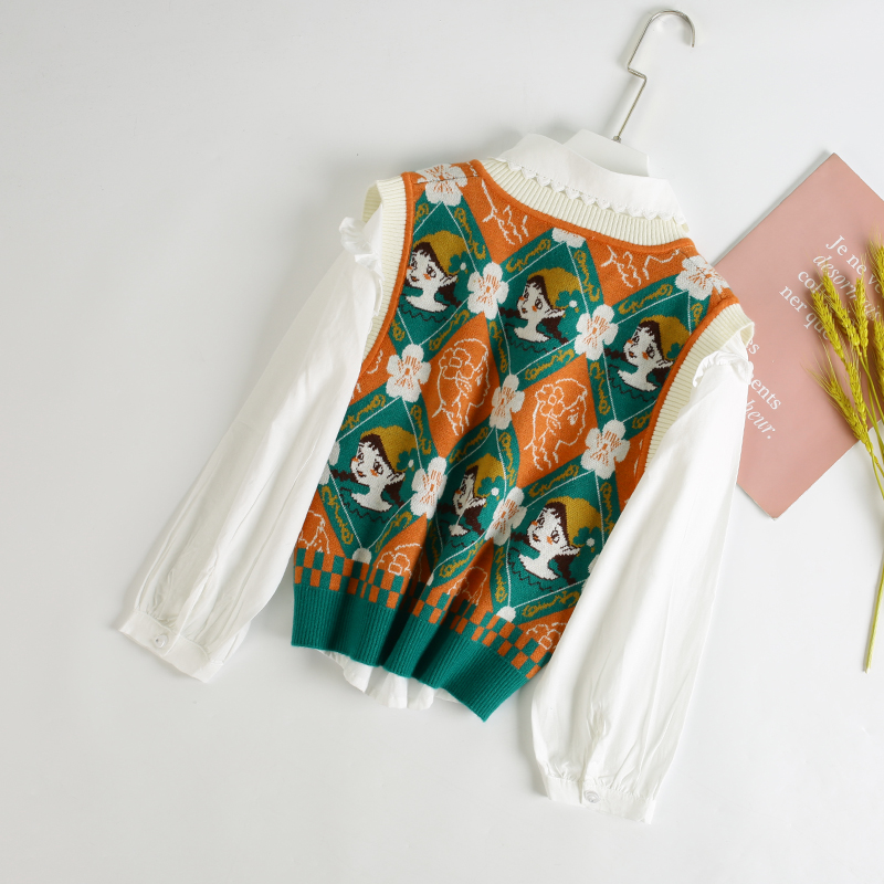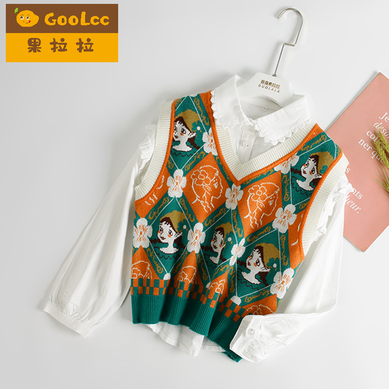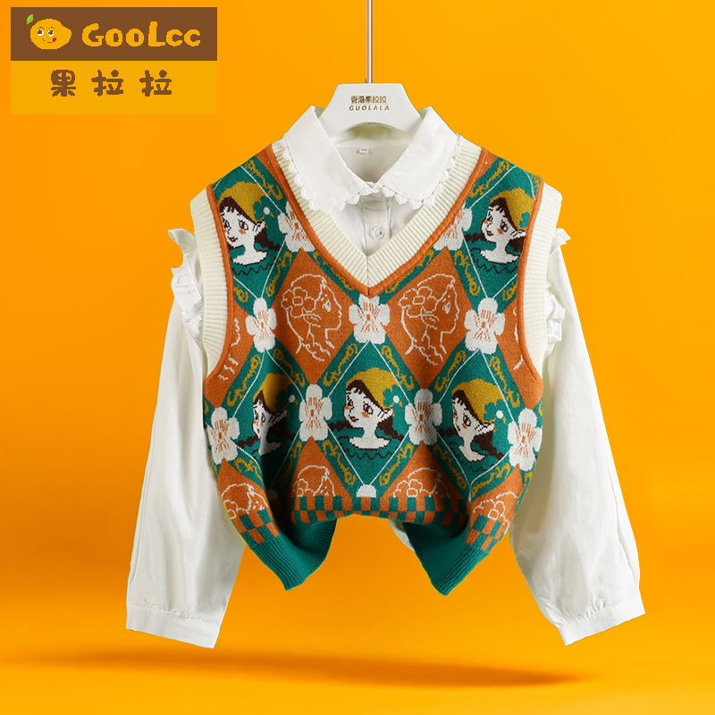 背心两件套秋季 女童印花针织马甲套装 儿童中大童衬衫 新款 2025春装