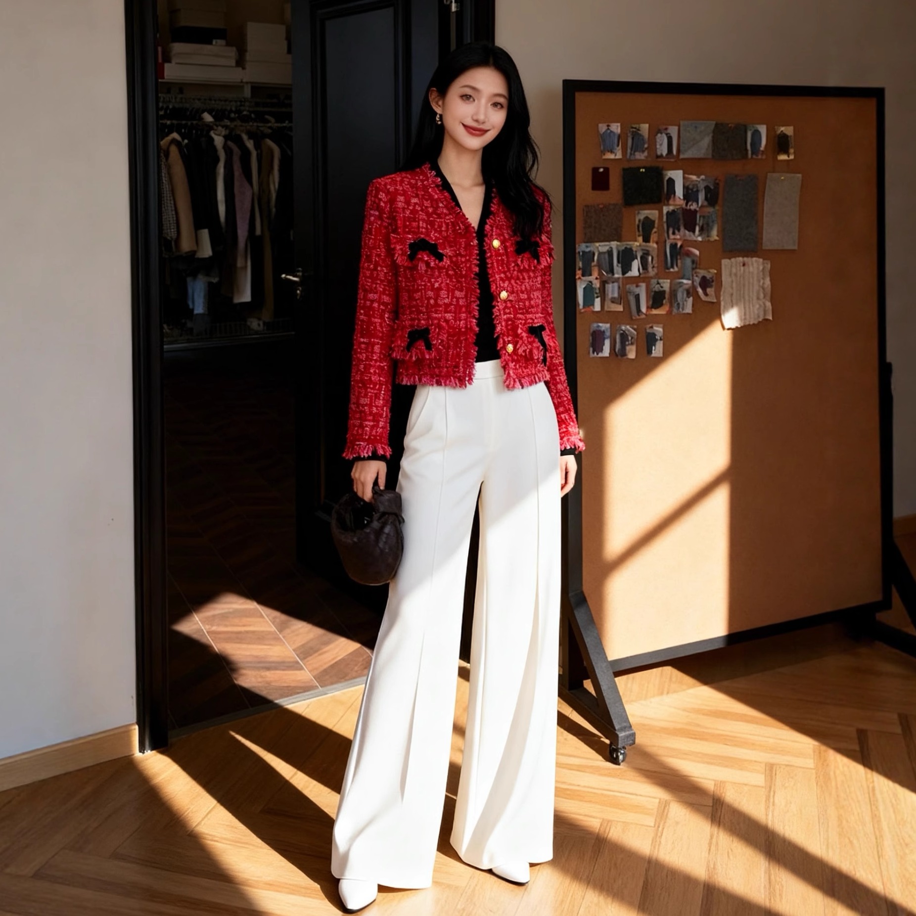 新款 小香风羽绒服100 粗花呢玫红色厚外套秋冬90白鸭绒圆领短款