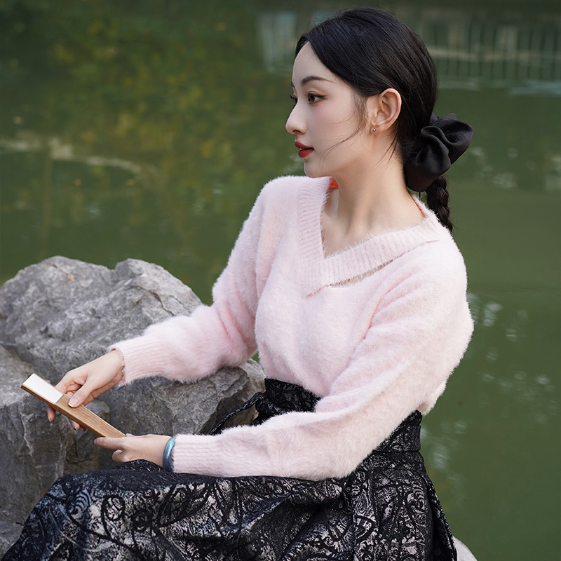 女毛衣宽松上衣 外套25早秋穿搭新款 阔色粉色撞色假两件针织衫 开衫