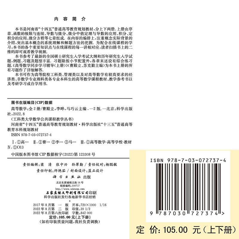 曹殿立 社9787030727374 高等数学 科学出版 马巧云 李晔 工科类大学数学公共课程教学丛书 上下册 第二版 现货 正版
