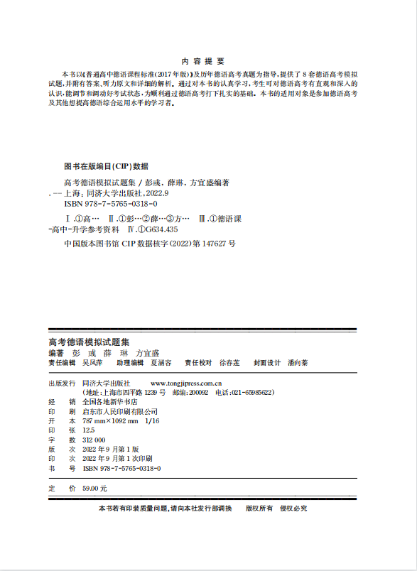 8套德语高考模拟试题附有答案 听力原文和详细 解析 高考德语模拟试题集 社 彭彧 同济大学出版 9787576503180 含参考答案详细解析