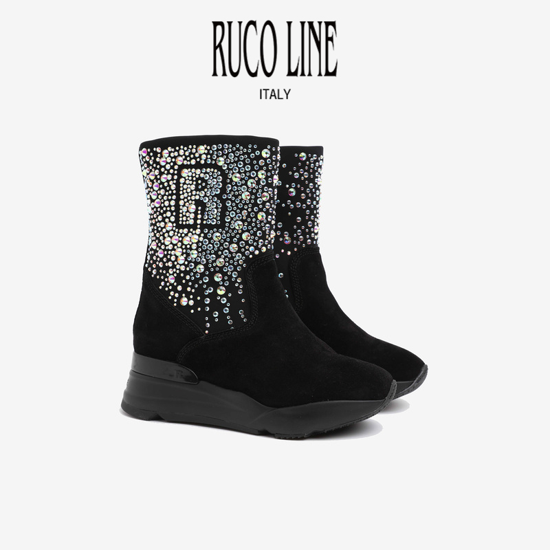 Ruco Line如卡莱意大利牛皮水钻短靴女士加绒9cm内增高厚底增高鞋
