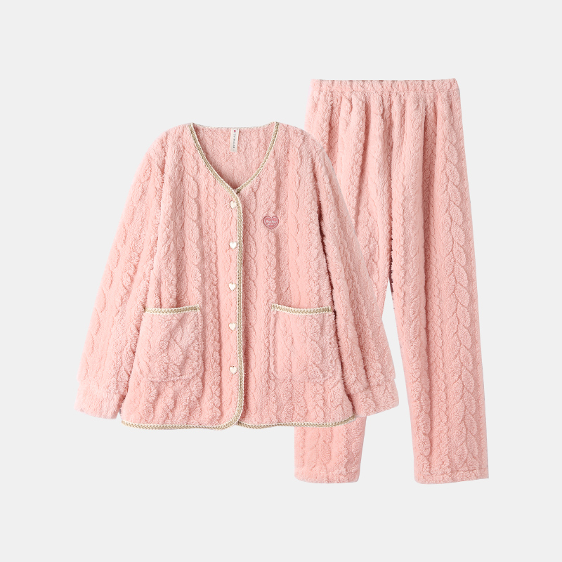 家居服套装 大码 加厚保暖法兰绒甜美开衫 芬腾珊瑚绒睡衣女士秋冬款