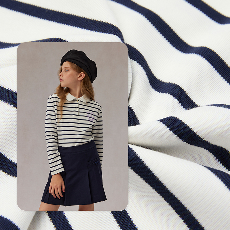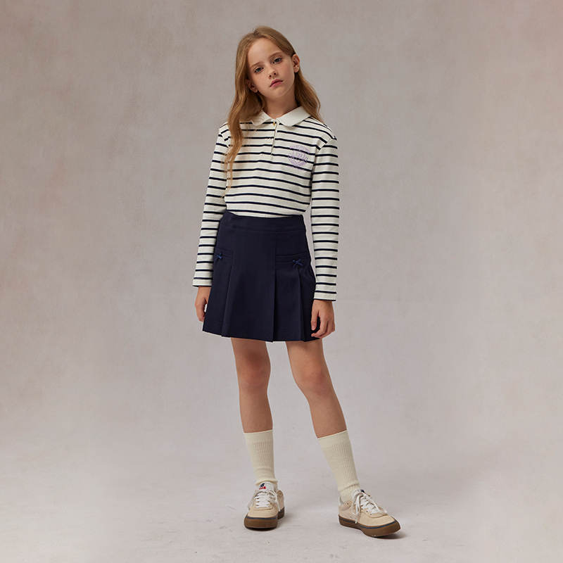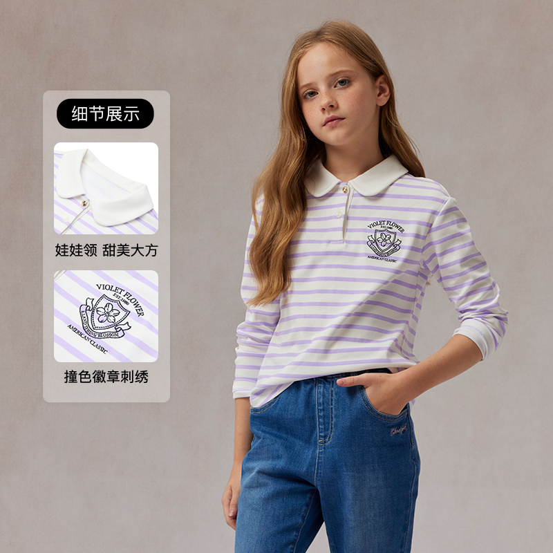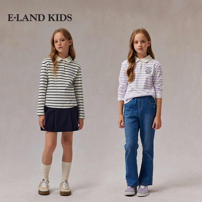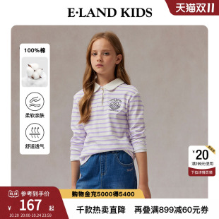 kids衣恋童装 eland 女童T恤25年春秋新娃娃领条纹长袖 100%棉