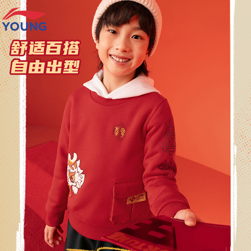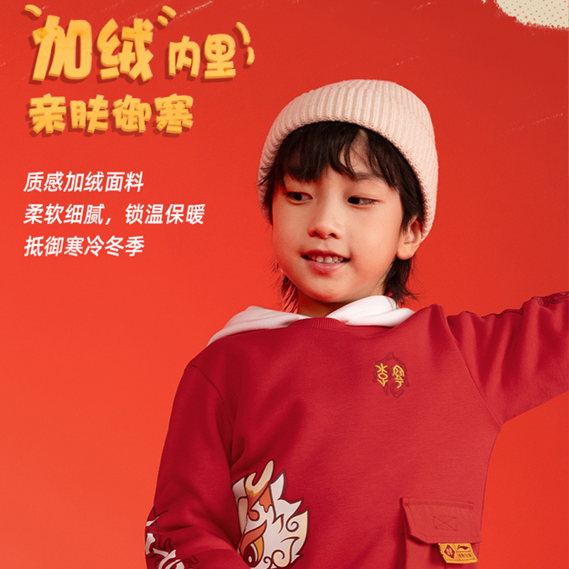 李宁童装 男小童加绒红色拜年服宝宝蛇年新年衣 儿童卫衣2025秋冬款