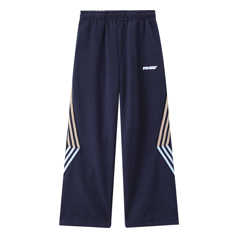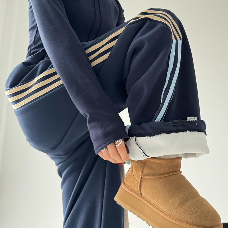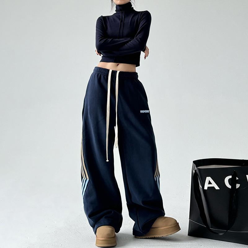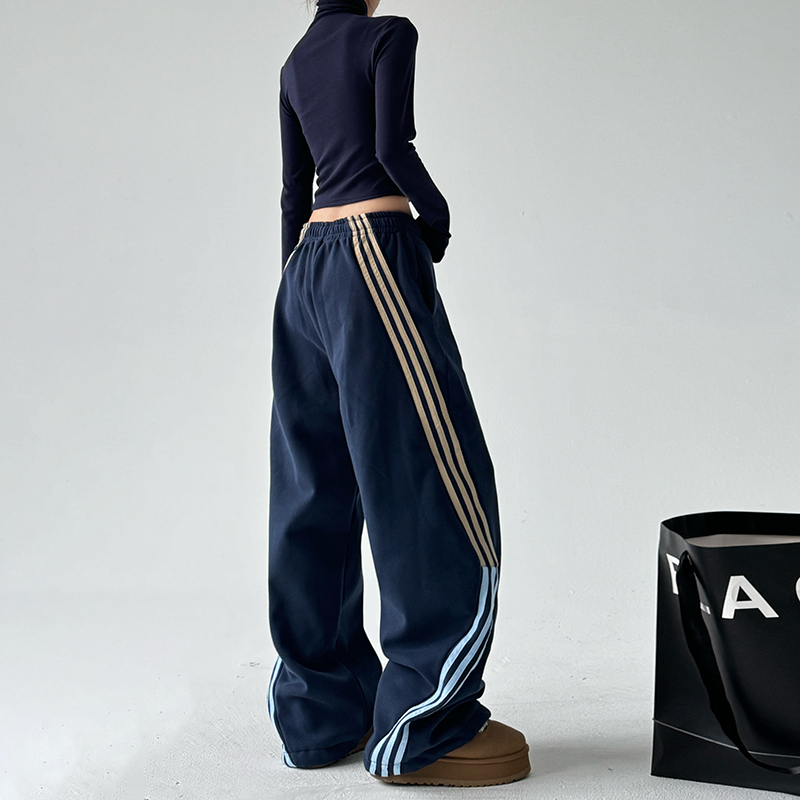 女2025秋冬加绒加厚设计感直筒休闲阔腿裤 美式 高街拼接条纹运动裤