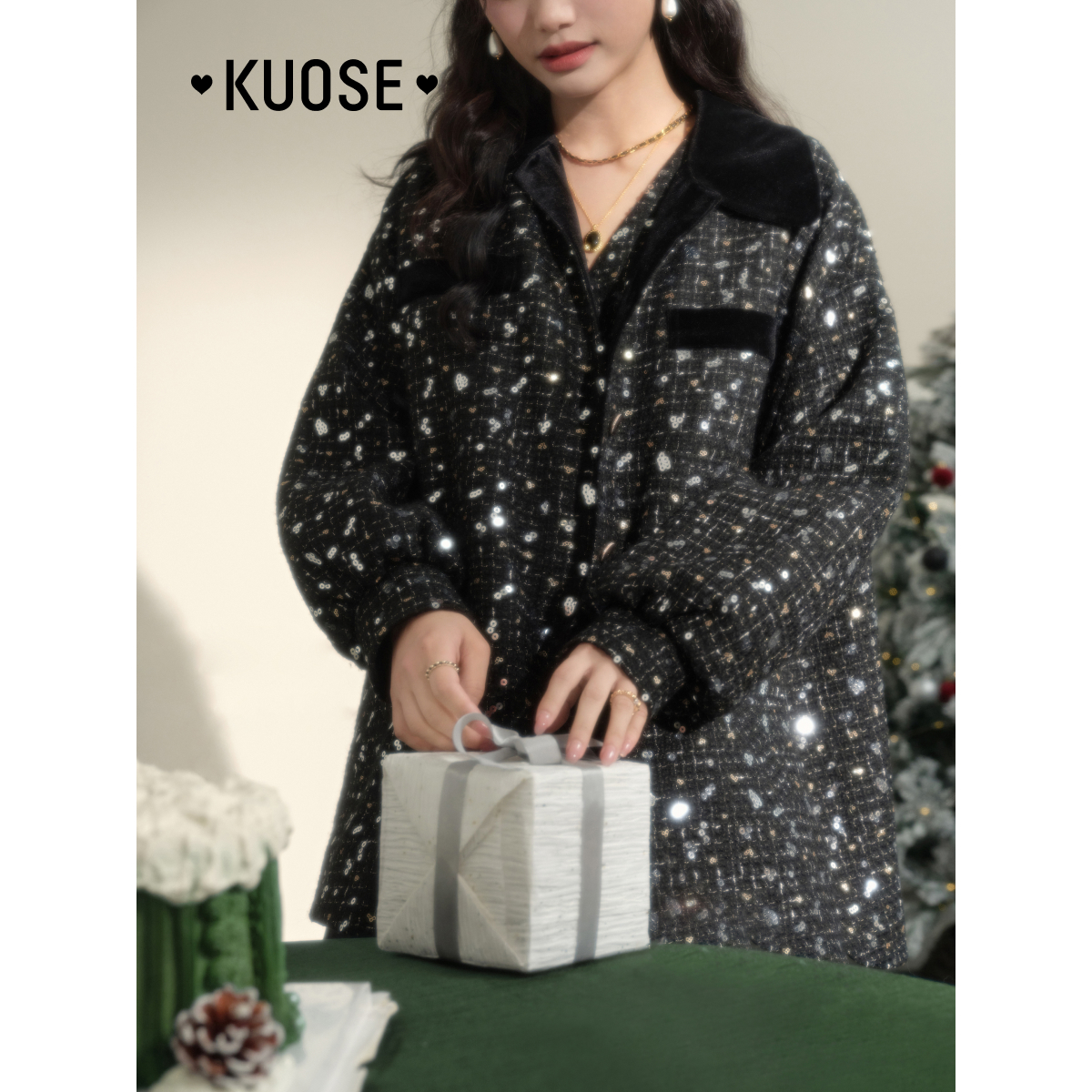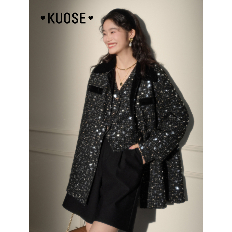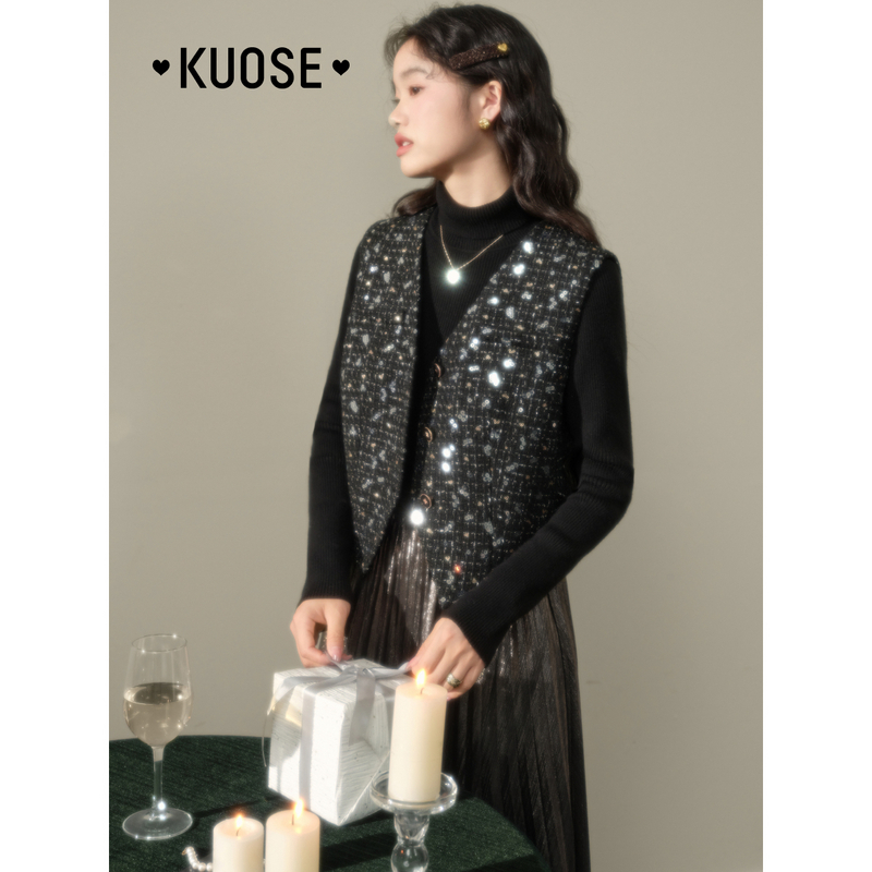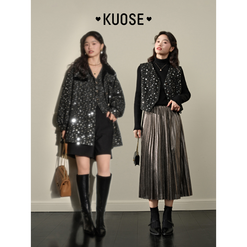 女装 新款 气质亮片上衣 2025秋冬季 阔色小香风翻领外套马甲两件套装