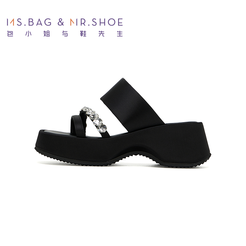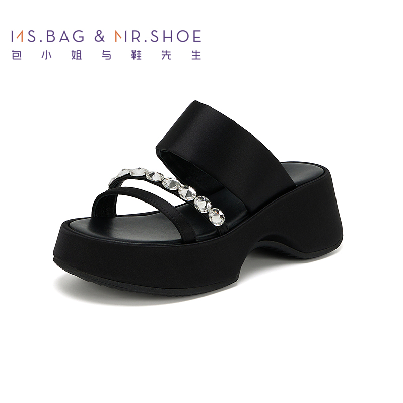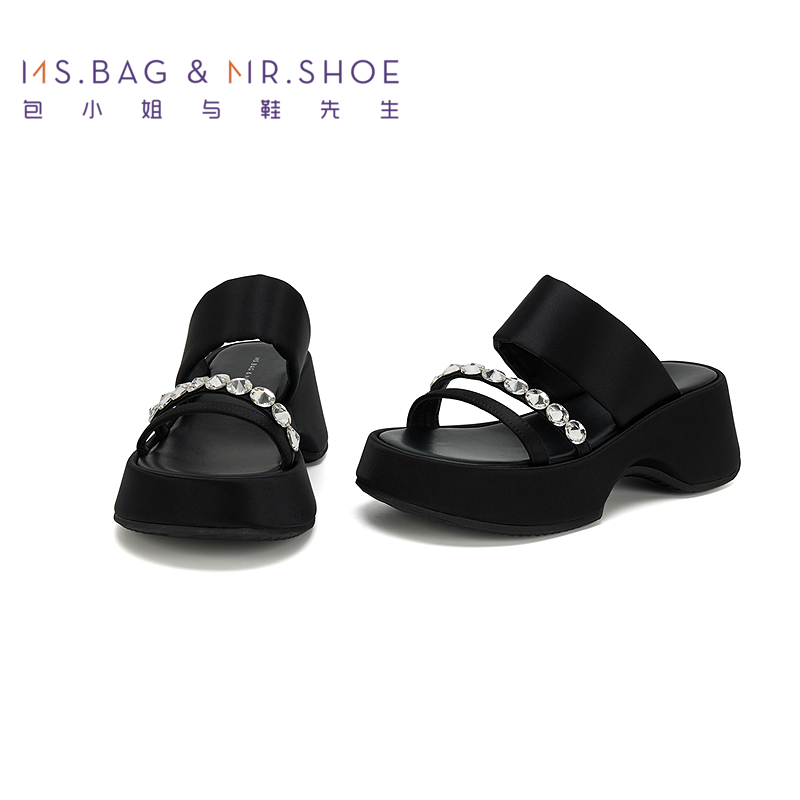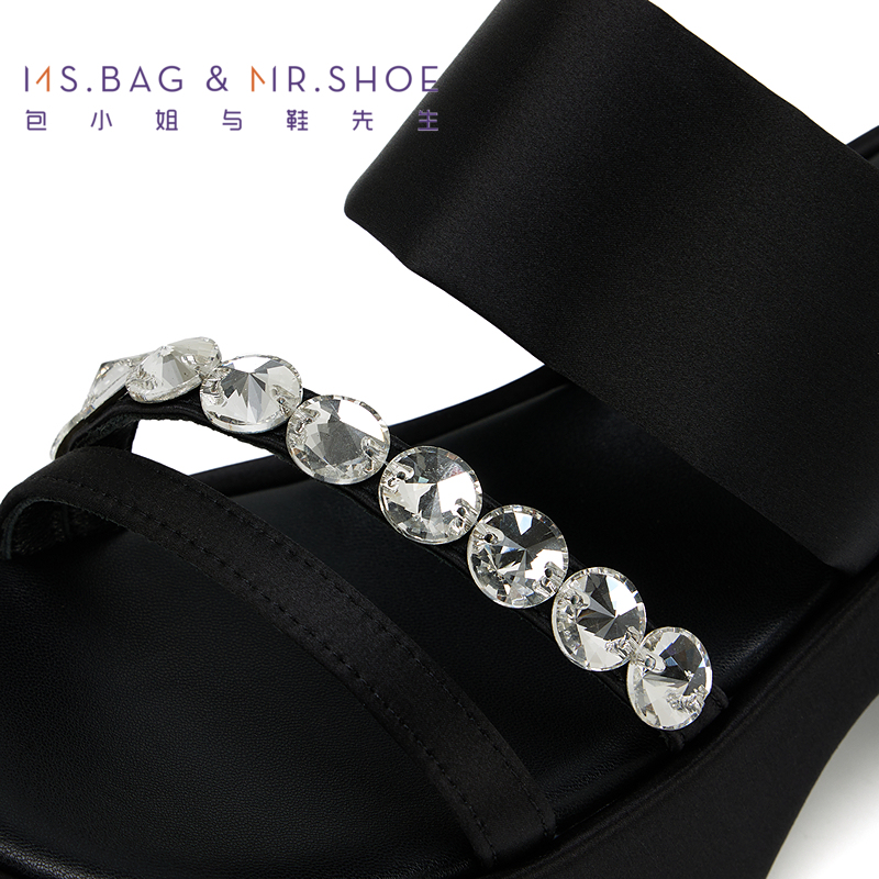 其他拖鞋 黑色水钻一字带凉鞋 方头绝美不累脚拖高跟鞋 新款 2025夏季