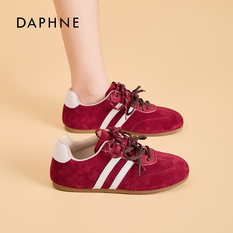 高质量真皮系带平底鞋 达芙妮红色德训鞋 女复古百搭久穿不累阿甘鞋