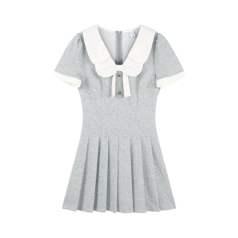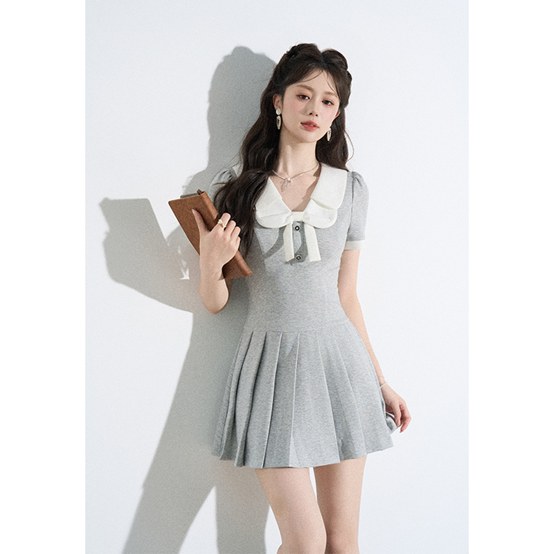 百褶短裙子 高级感掐腰显瘦法式 学院风娃娃领灰色短袖 连衣裙女夏季