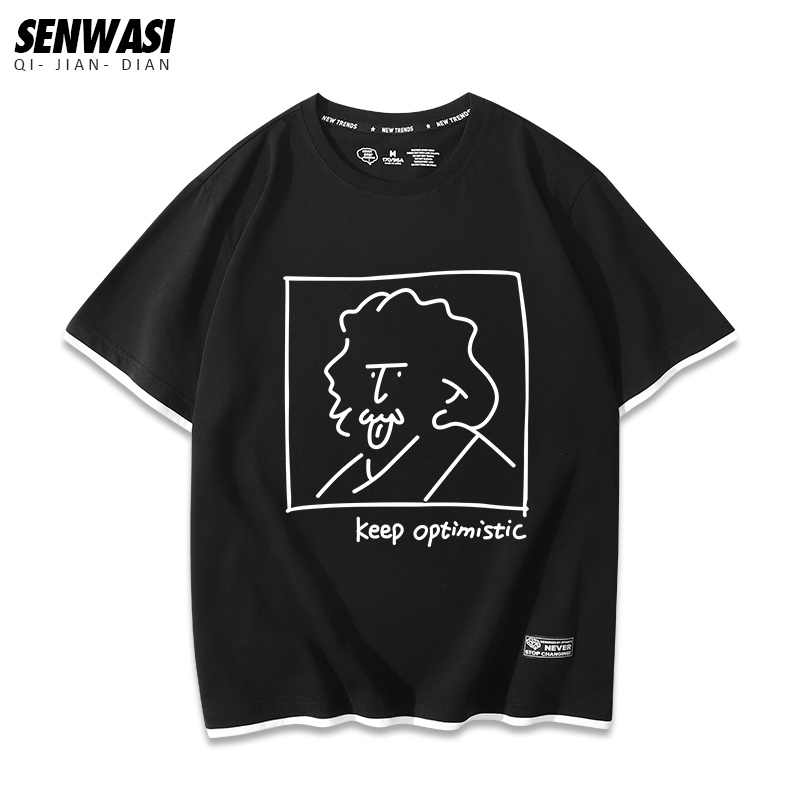 百搭休闲T恤衫 爱因斯坦涂鸦趣味搞怪印花假两件短袖 男女学生夏季