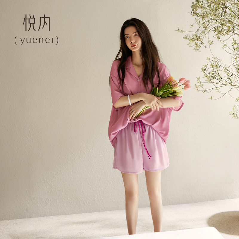 夏季 丝绸开衫 夏天冰丝短袖 家居服薄款 粉色可外穿 短裤 悦内睡衣女款