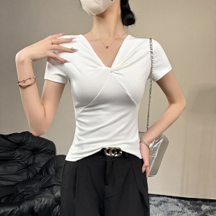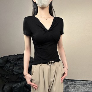 显瘦正肩气质减龄上衣女 新款 黑色不规则V领扭结短袖 T恤女2025夏季