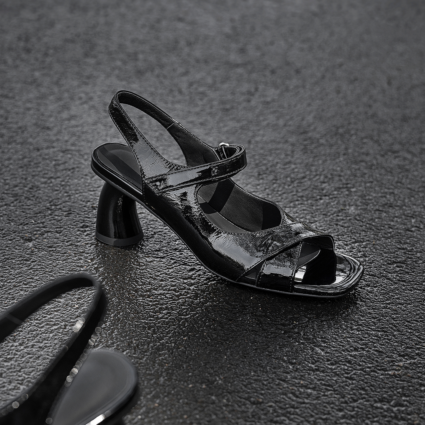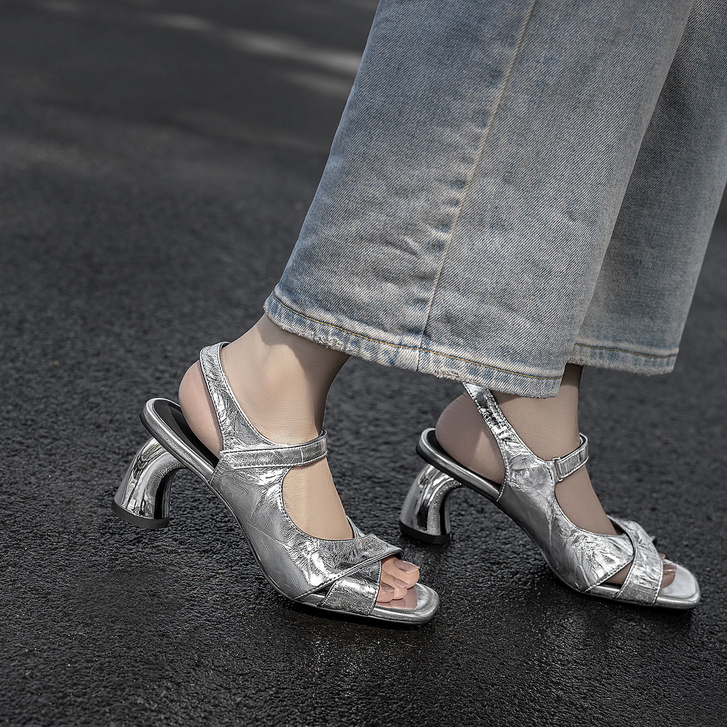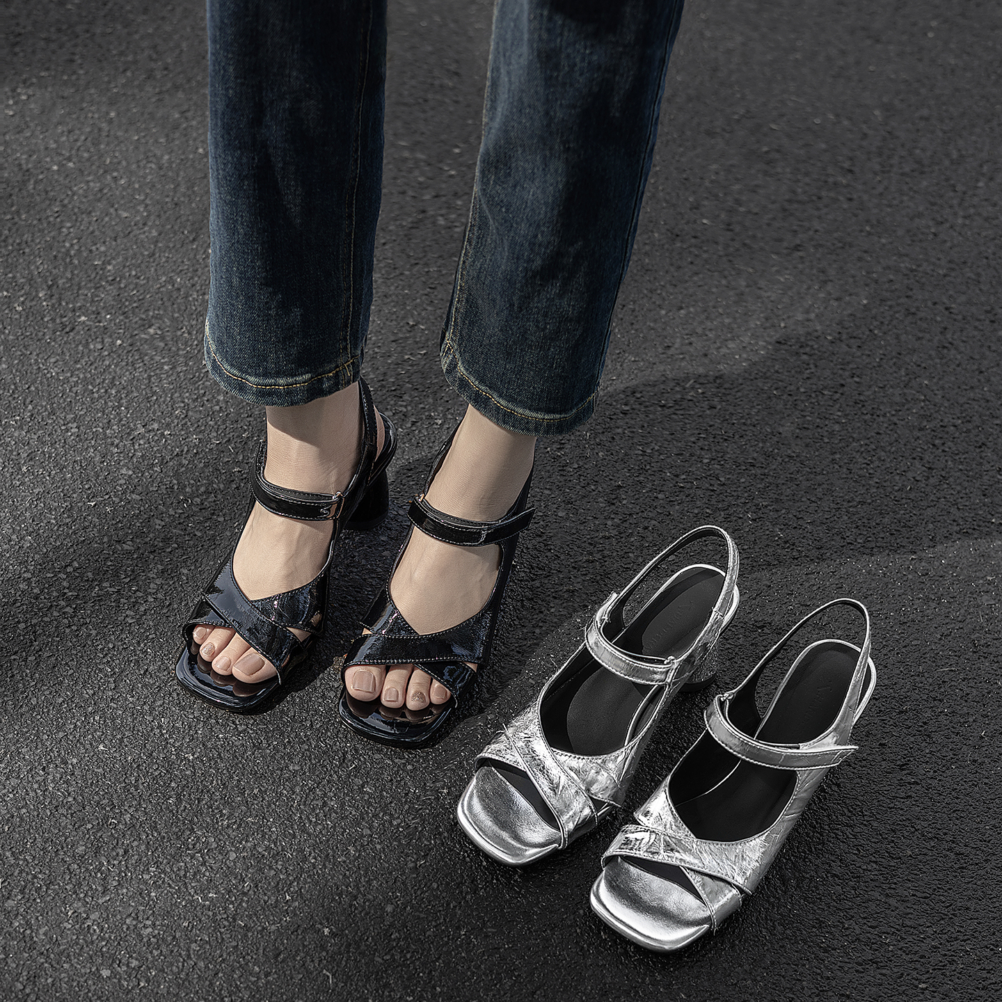 欧洲站2025新款 女 欧货真皮一字扣细跟魔术贴露趾高跟凉拖后空凉鞋