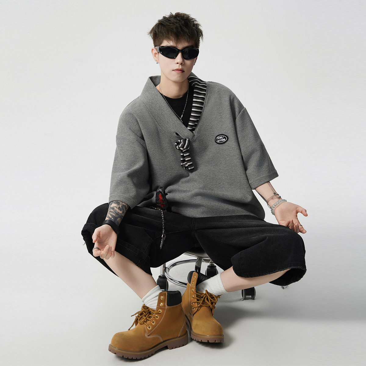 体恤衫 V37美式 男宽松街头ins半袖 T袖 潮牌条纹领带拼接假两件短袖
