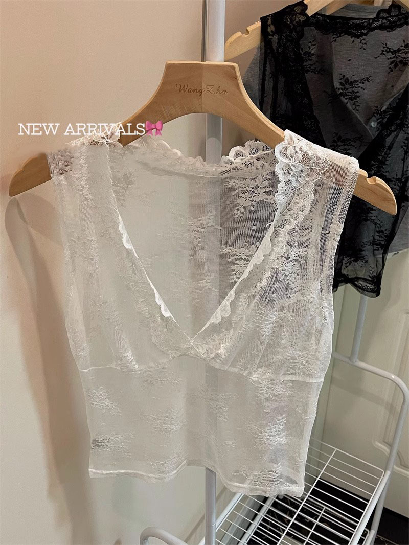 上衣女夏性感修身 法式 叠穿神器大v领背心花边蕾丝打底衫