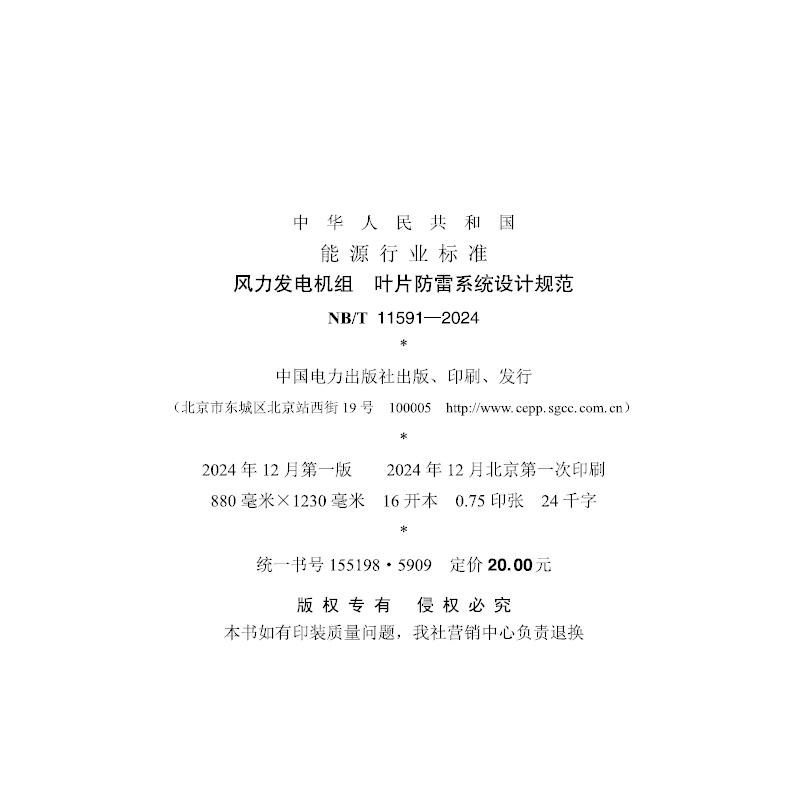 风力发电机组 11591—2024 NB/T 叶片防雷系统设计规范 按需印刷