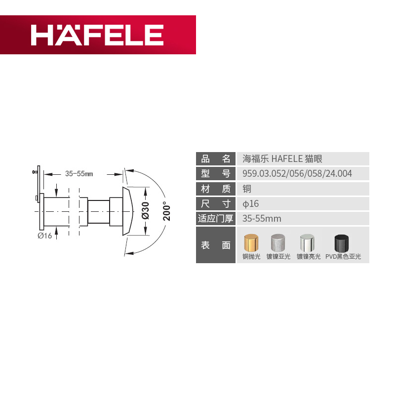 德国海福乐HAFELE室内门通用猫眼铜制门镜防盗门防尘防盗带盖门镜