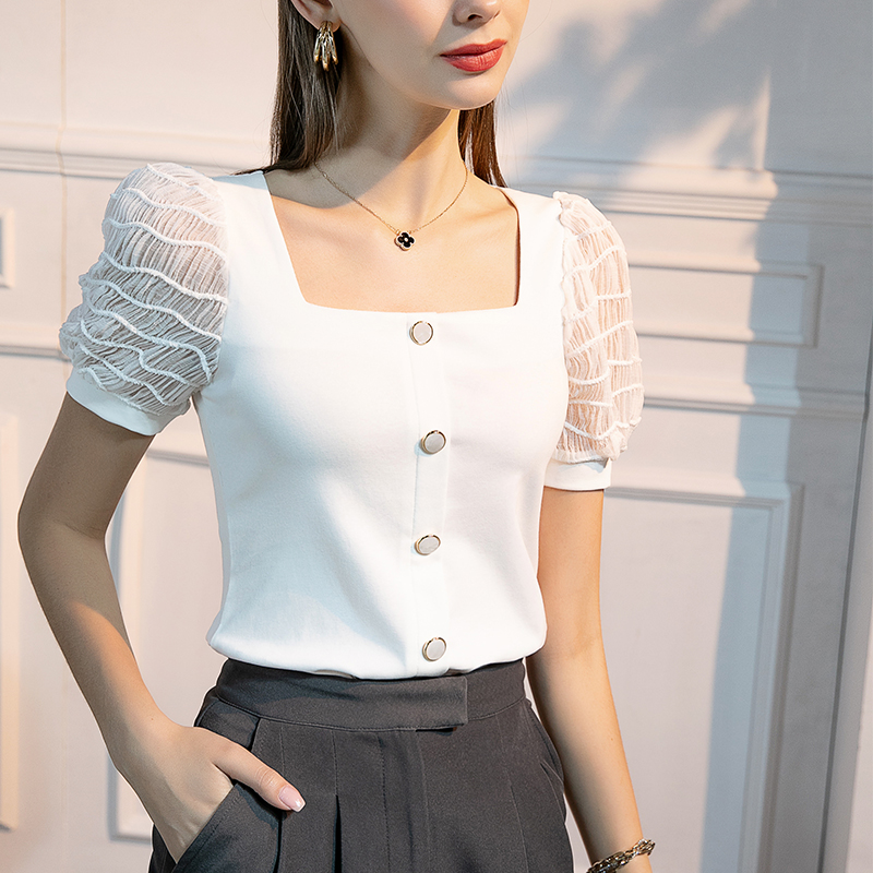 纽扣洋气春款 镂空拼接T恤女短袖 欧洲站上衣 方领泡泡袖 2025夏季