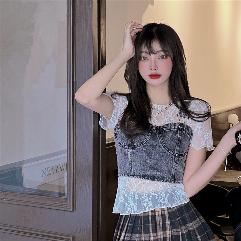 女内搭短袖 纯欲提花蕾丝打底衫 薄网纱百搭镂空上衣潮 夏装 2021新款