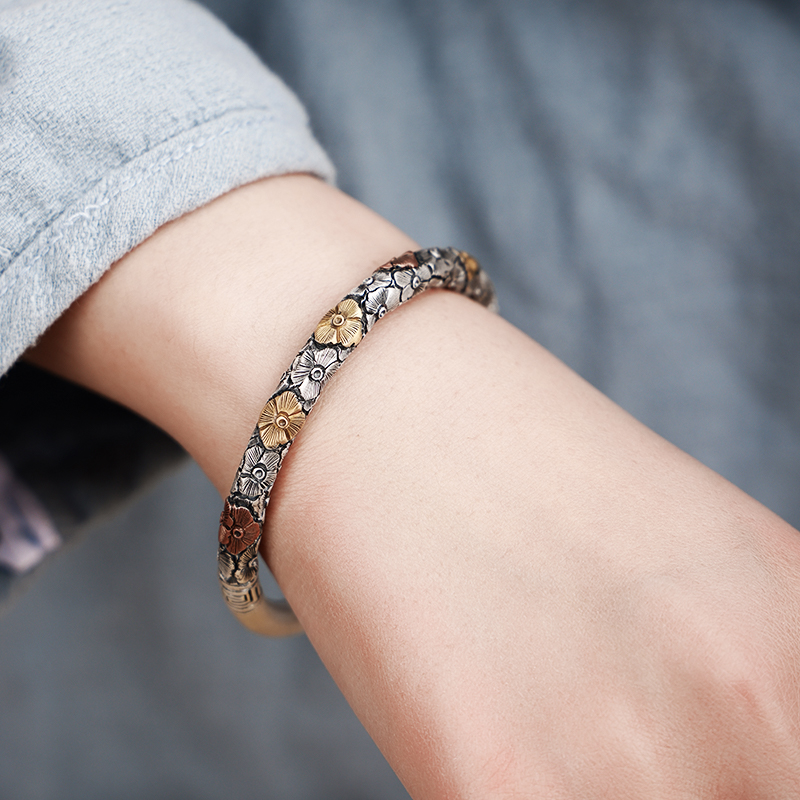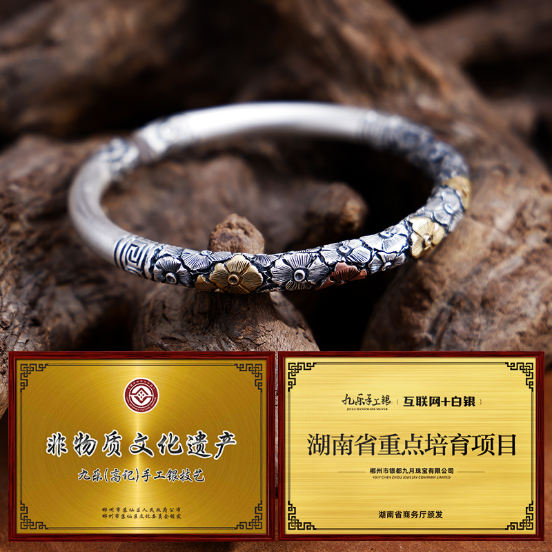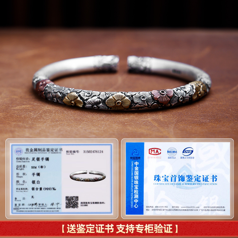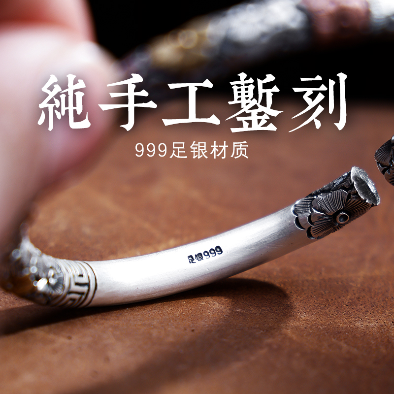 周六福手镯S999足银福云祥纹莲花实心镯子优雅气质节日礼物