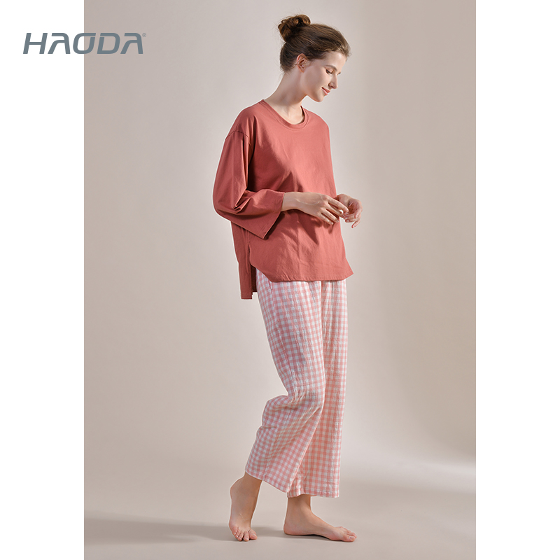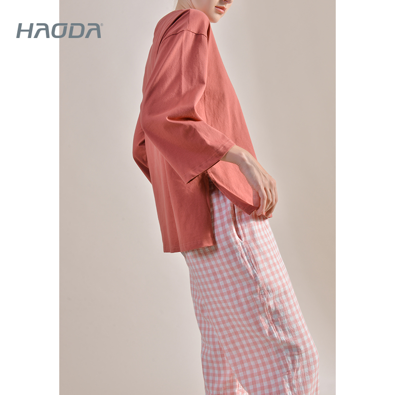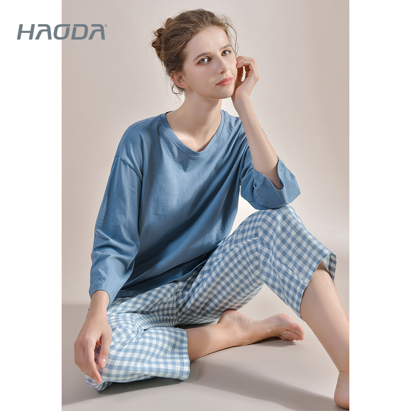 家居服套装 柔软透气蕾丝花边格子短袖 薄款 秋鹿梭织纯棉睡衣女夏季