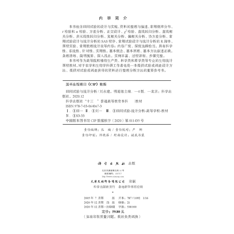 第四版 科学出版 第4版 明道绪 社 刘永建 田间试验与统计分析