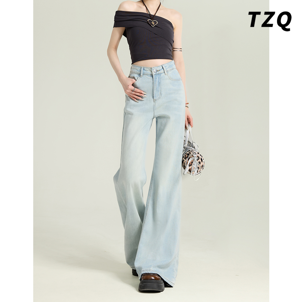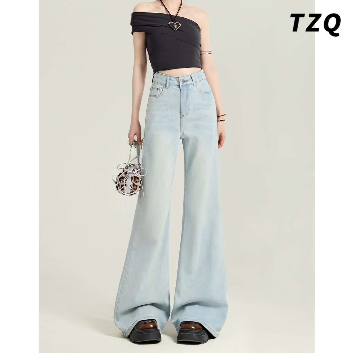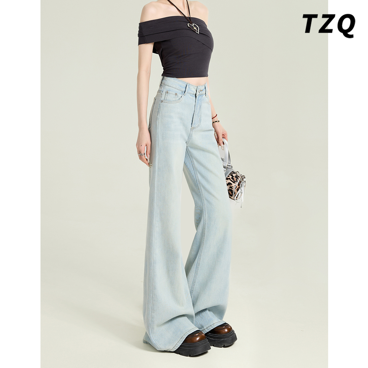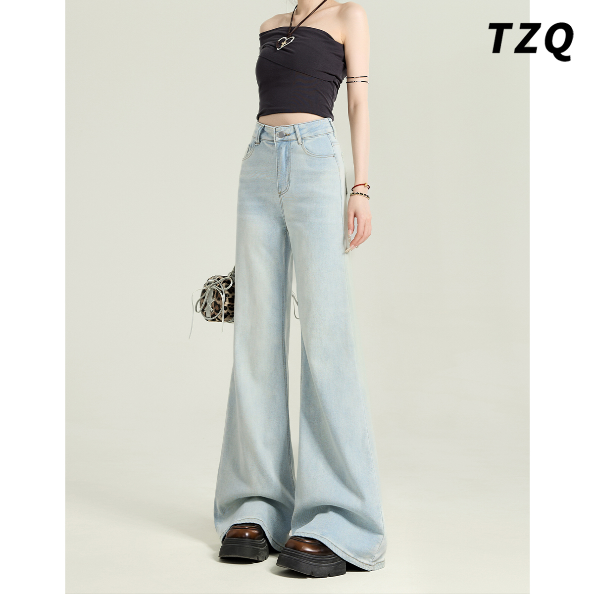 宽松显瘦不贴腿拖地喇叭裤 新款 女2025夏季 浅色高腰弹力微喇牛仔裤