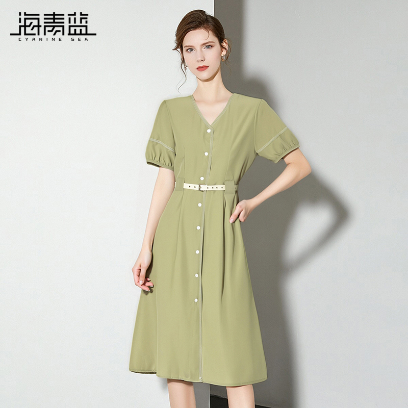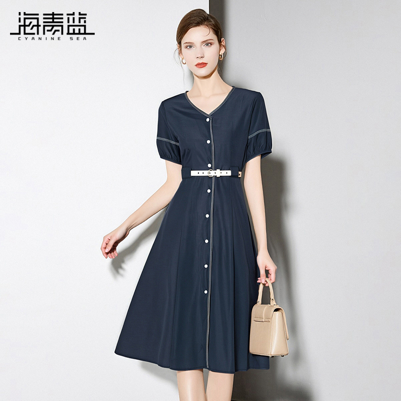气质中长款 海青蓝 夏时尚 连衣裙女2025新款 a字裙 高级设计感短袖