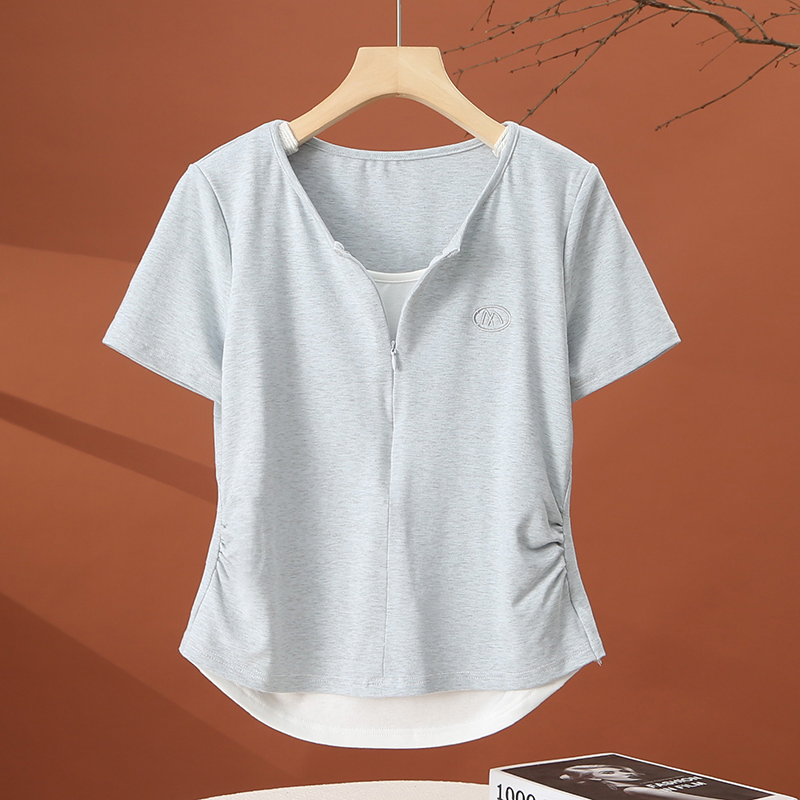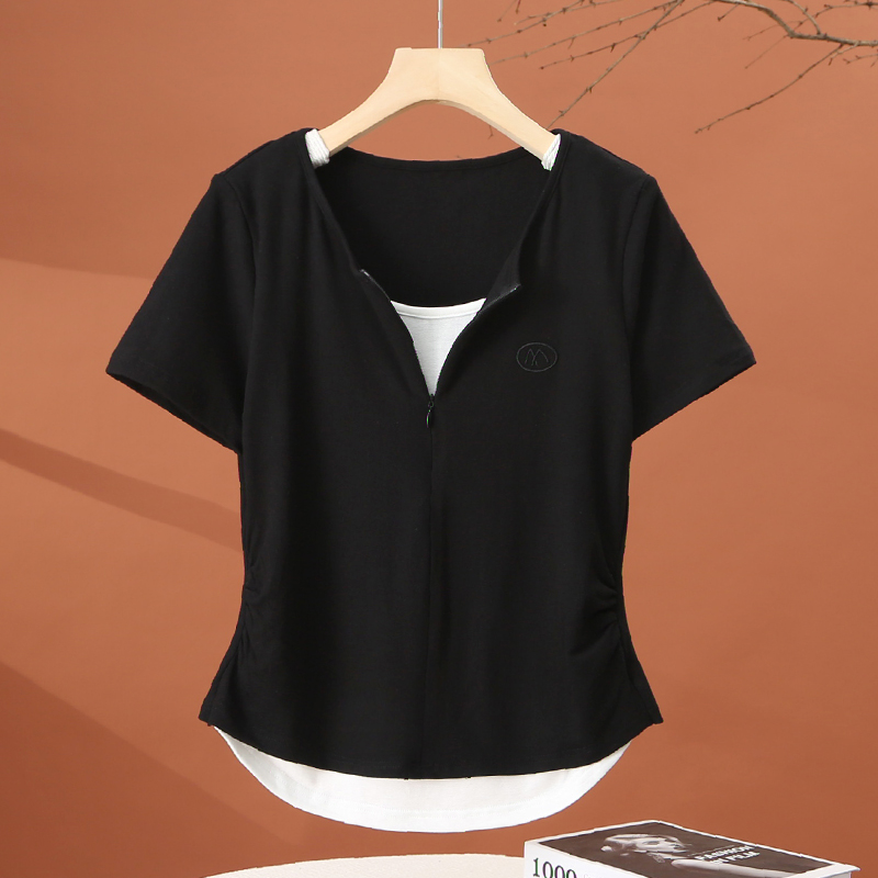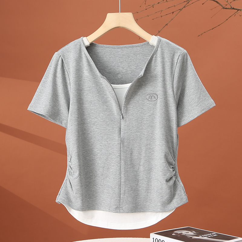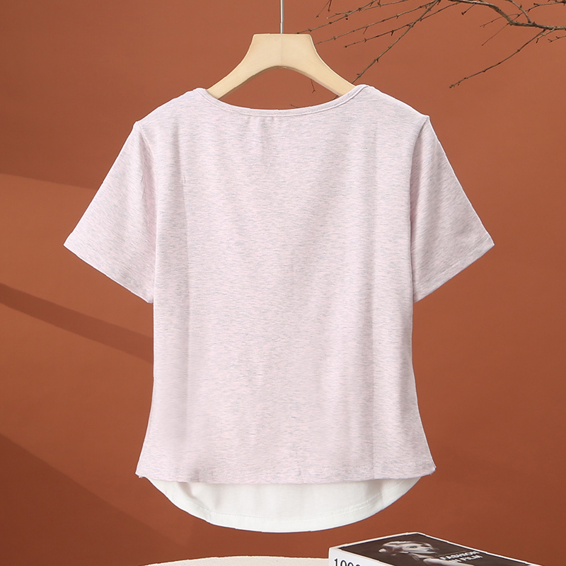 t恤女夏季 短款 2025新款 减龄时尚 收腰粉色上衣 洋气小衫 假两件短袖
