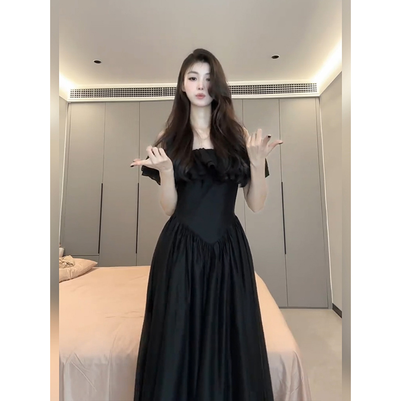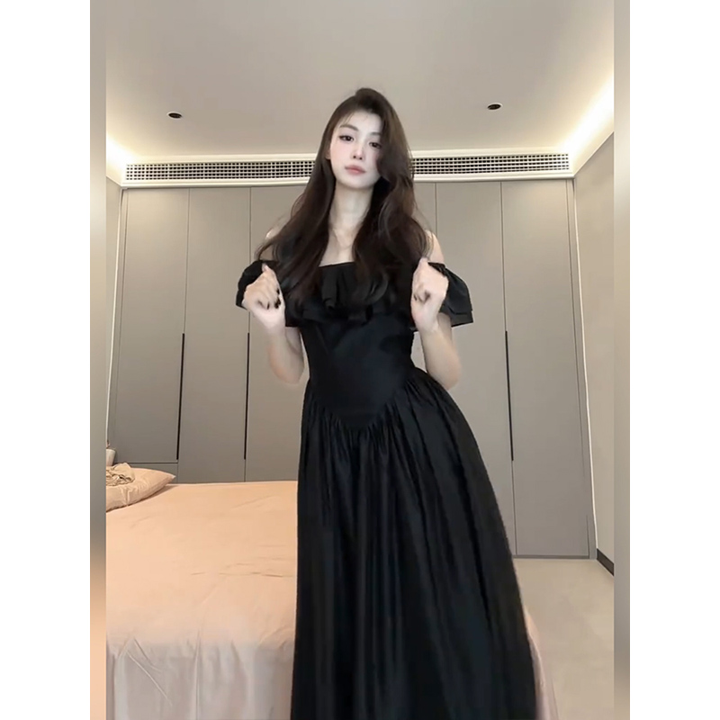 高级感收腰度假长裙 气质一字肩黑色连衣裙女25年夏季 XZY 微胖法式