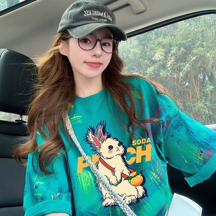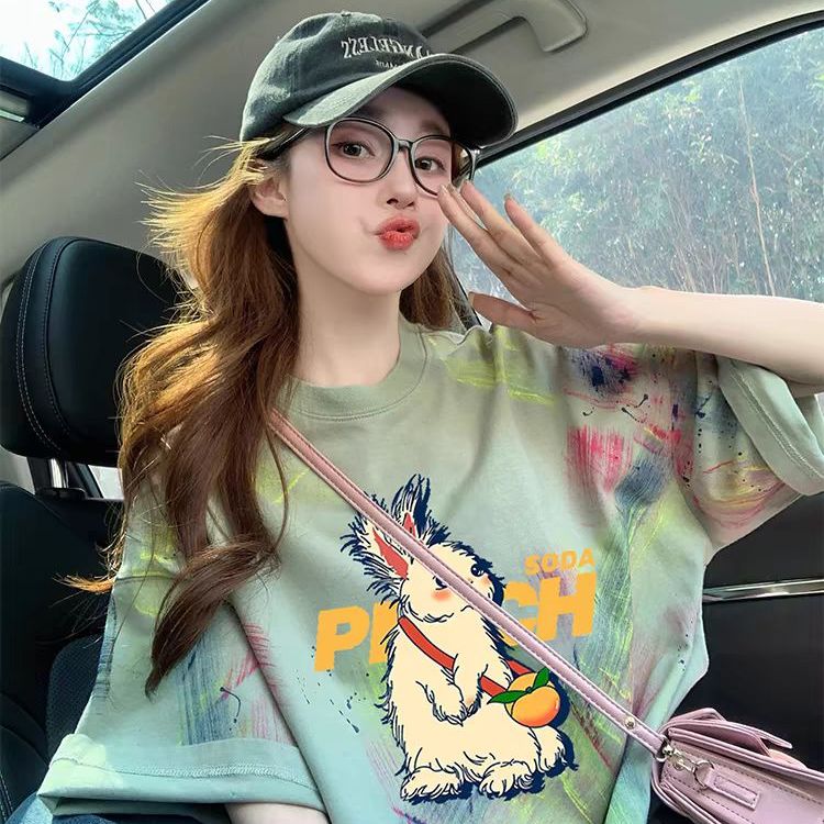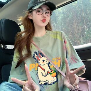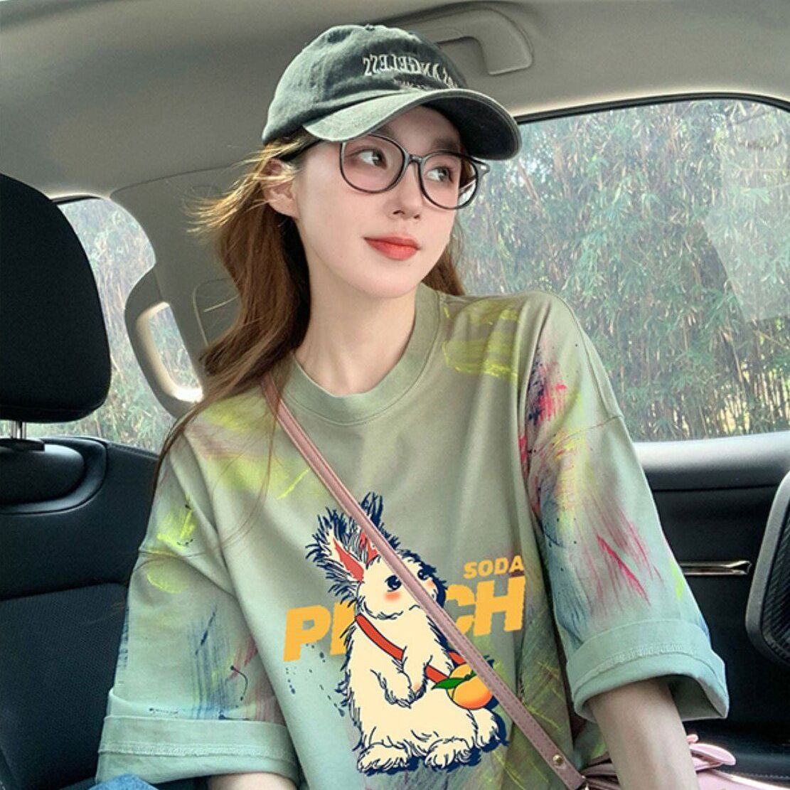 女装 美式 复古涂鸦纯棉短袖 新款 潮牌设计感显瘦上衣 t恤女夏季 大码