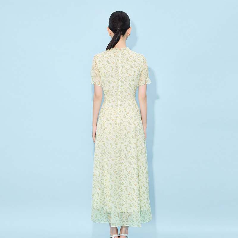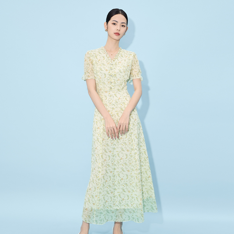 新款 夏季 米黄桑蚕丝印花连衣裙子V领收腰长裙 马天奴女装 专柜正品
