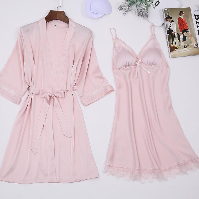 带胸垫吊带睡裙性感睡袍二件套仿真丝家居服开衫 性感睡衣 女士夏季