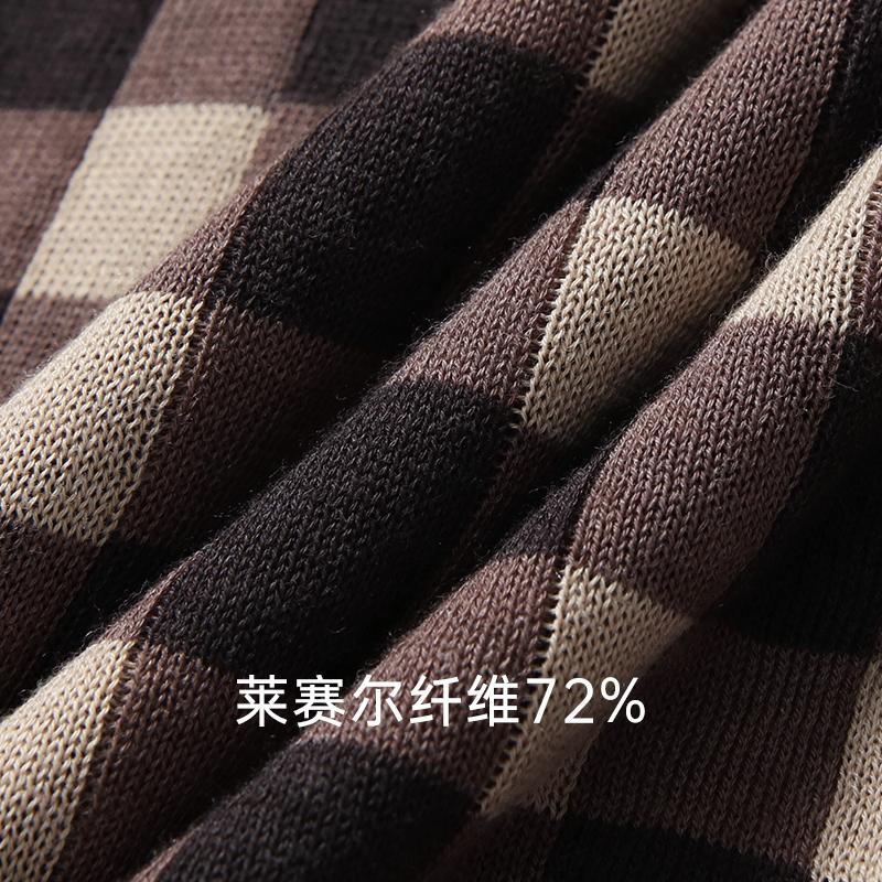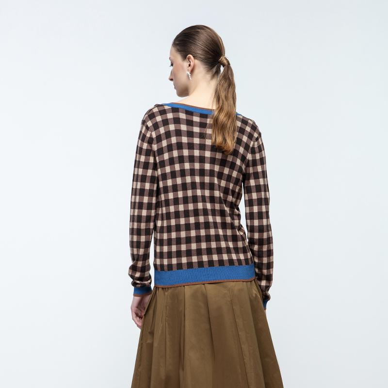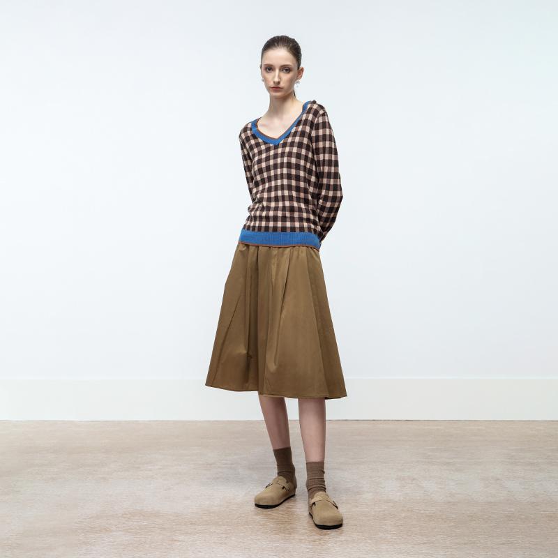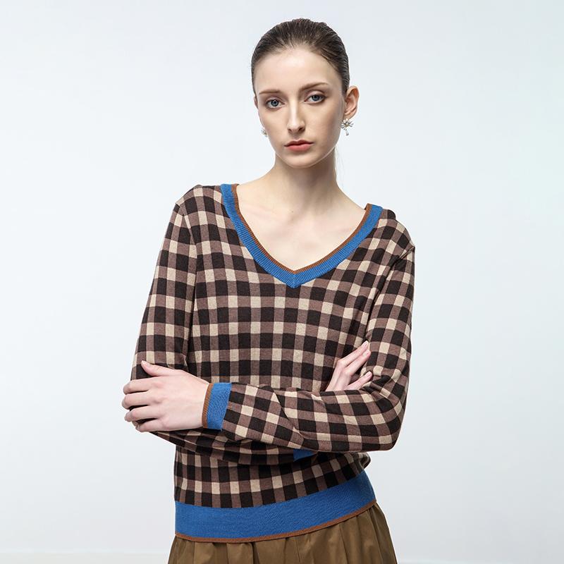 Keywearcloud奇威秋季 上衣 格子拼色V领毛衣女典雅气质针织小衫