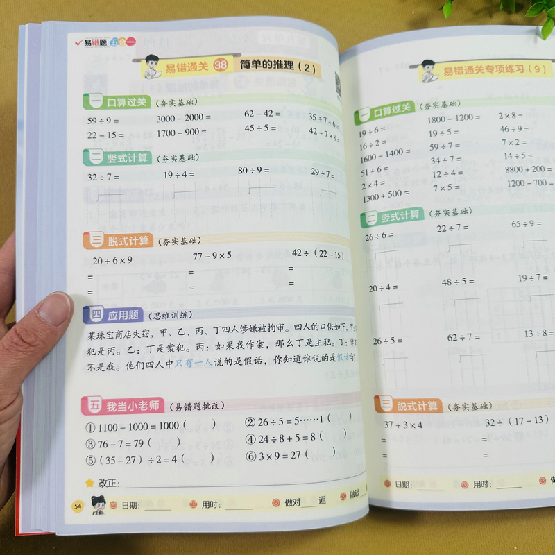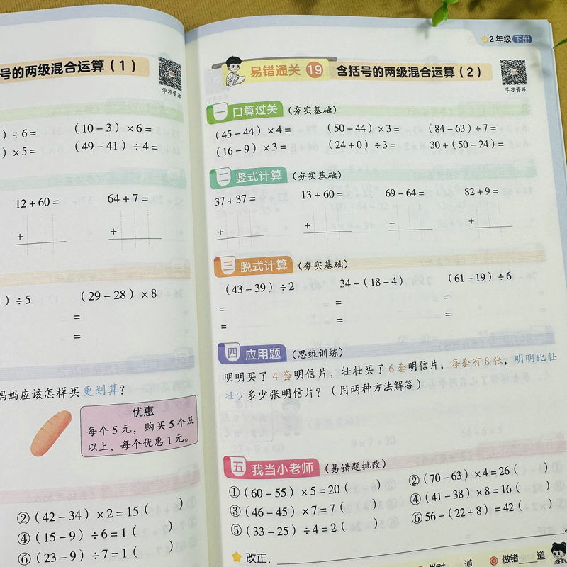 教材同步练习册表内除法图形运动混合运算有余数除法万以内数 应用题易错题批改五合一训练人教版 认识 脱式 二年级下册数学口算竖式